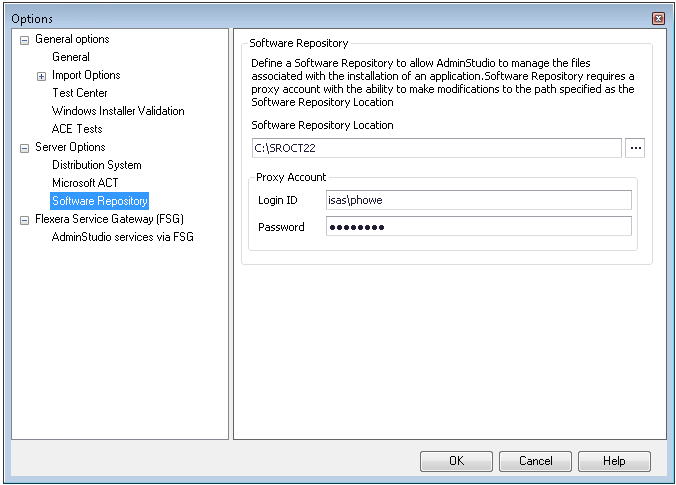 Proxy AccountSpecify the Login ID and Password for a Proxy Account that AdminStudio can use to access and modify the specified Software Repository Location folder. You cannot use Windows Authentication for this Proxy Account. The Proxy Account needs full control on the Software Repository Location folder at the directory level as well as at the sharing level. Only such accounts can be used as a Proxy Account to access the Software Repository Location directory.