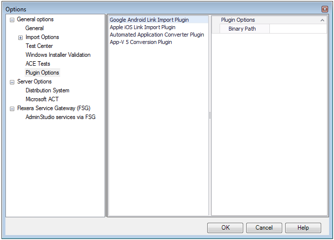 On the Plugin Options tab of the Application Manager Options dialog box, you can specify options for AdminStudio plug-ins including the import of Google Android and Apple iOS public store apps, Automated Application Converter, App-V 5 conversion, and Microsoft Intune conversion. The Plugin Options tab includes the following subtabs.