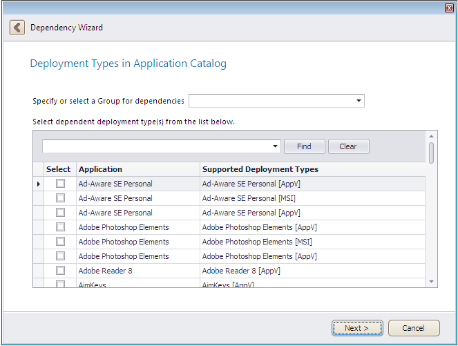 On the Deployment Types in Application Catalog panel, you select dependent applications from the Application Catalog.