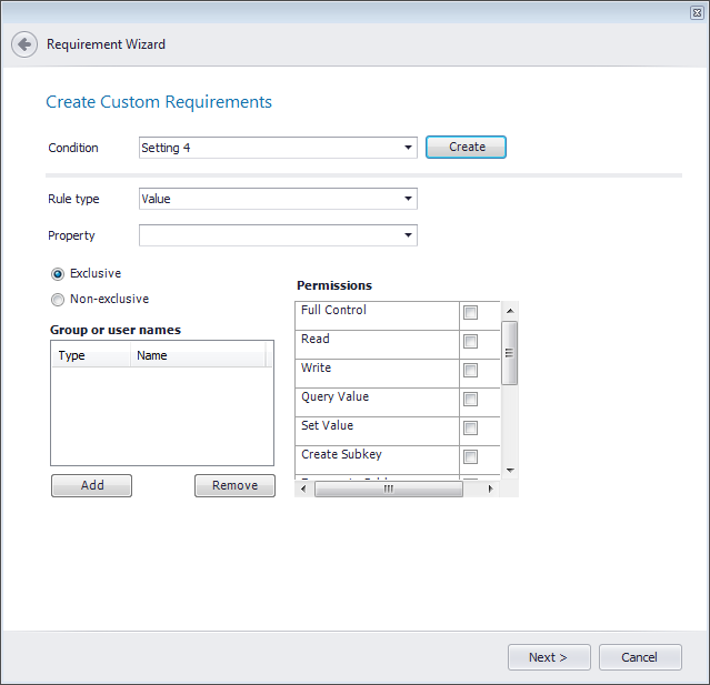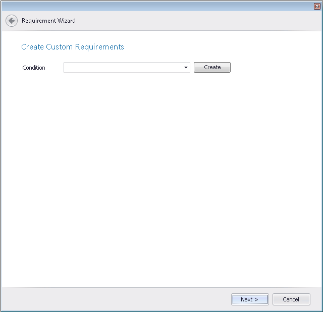 On the Create Custom Requirements panel, which appears if you select Custom requirements on the Welcome panel, you specify the custom conditions for the requirement.