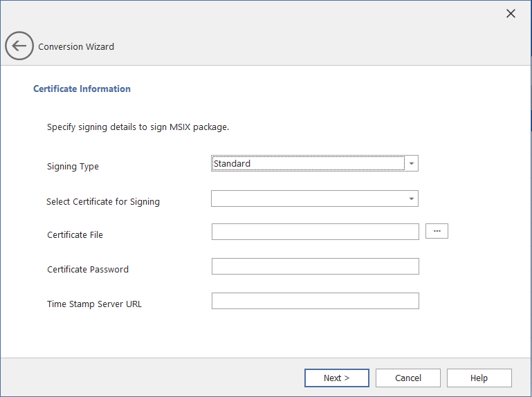 Standard— Uses this option to digitally sign MSIX packages with a pre-configured certificate. Suitable for most common signing scenarios.