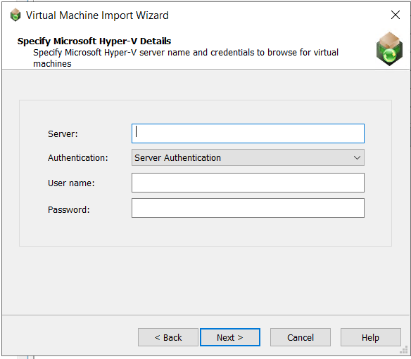 | Server Name | Enter the server name of the Microsoft Hyper-V Server that you want to connect to. |