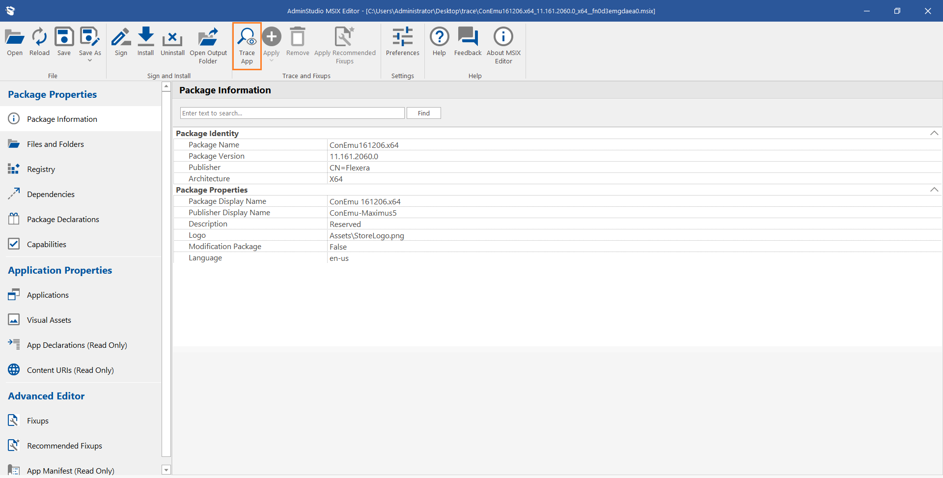 2. Click on the Trace App button in MSIX Editor ribbon.