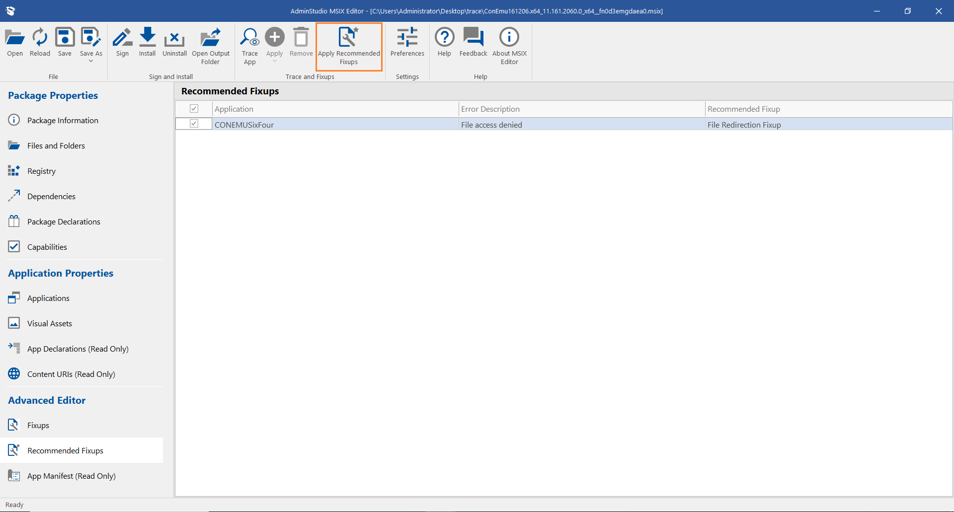 MSIX Editor can automatically recommend fixups for the run time issues encountered while testing an application during trace. The automatic recommendation of fixups currently supports only the File Redirection Fixup and Registry Fix.