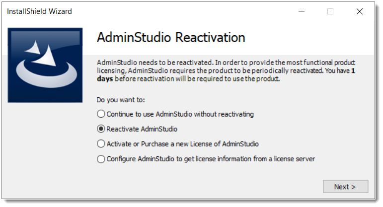 Launch AdminStudio to see the AdminStudio Reactivation wizard.